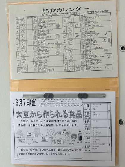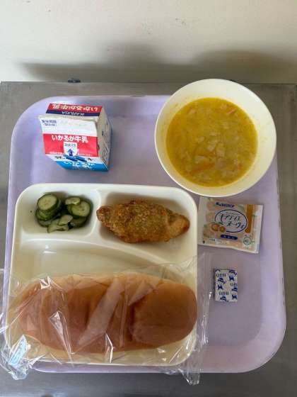 コッペパン、みかんジャム、牛乳、サーモンフライ、豆乳スープ、きゅうりのバジル風味サラダ、固形チーズ