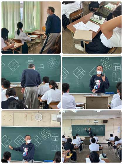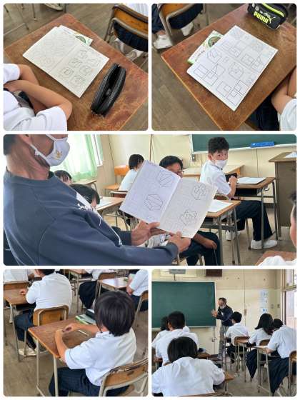 キャビネット図、等角図、第三角法の描き方を復習した後、立方体をいくつか積み重ねた立体のシルエットを第三角法であらわした図を等角図であらわす学習をしました。