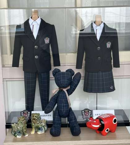 校長室前のミニチュア制服の前に座らせていたスラックスとスカートと同じ柄の熊のぬいぐるみを立たせています。