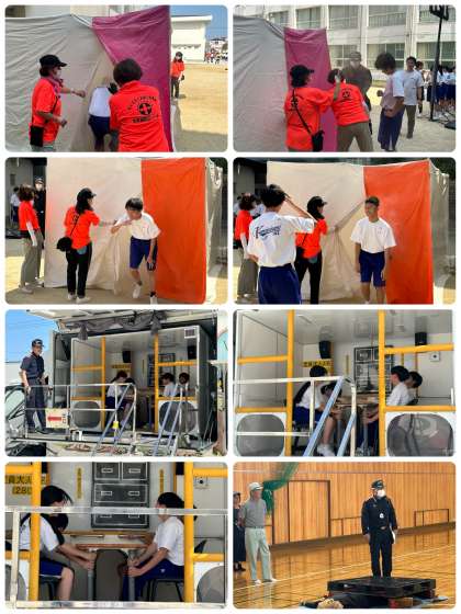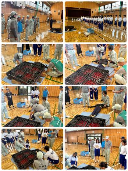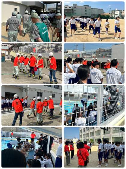震度7の地震が発生した想定で運動場への避難をし、阪井校長先生からのお話、平野区安井副区長あいさつの後、各訓練場所に移動しました。