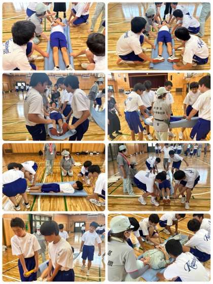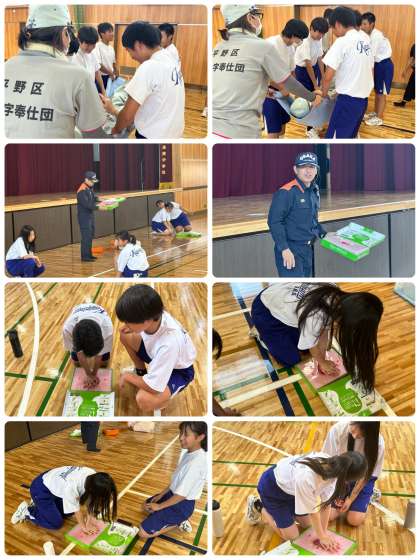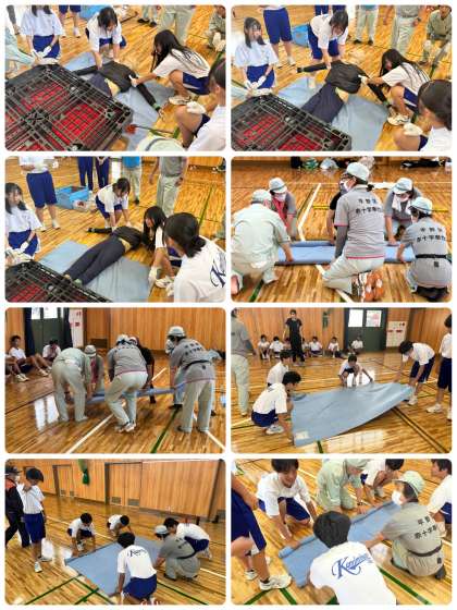 1年生はDVDを用いた学習、2年生は可搬式ポンプ訓練・水消化器体験やけむり体験・バケツリレー、3年生は起震車訓練・体育館での搬送訓練・救出訓練・心配蘇生訓練を行いました。
