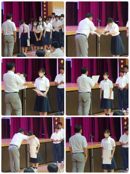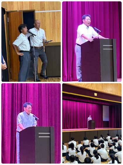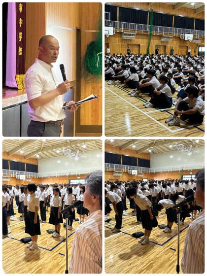 表彰の後は、阪井校長先生から1学期に引き続き、2学期も加美南中学校生としての自覚と誇りを持って行動してほしいとのお話と「授業で理解出来ているのに、宿題をする必要があるのか」についてのお話がありました。