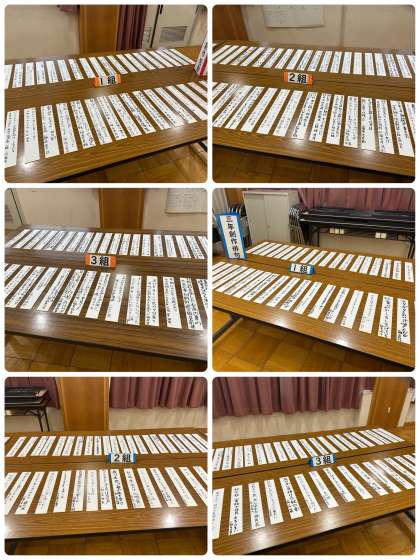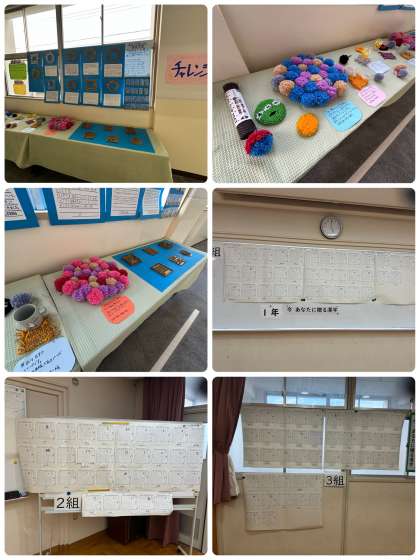 チャレンジ教室前のチャレンジ工芸作品と多目的室の1・2・3年国語科作品です。