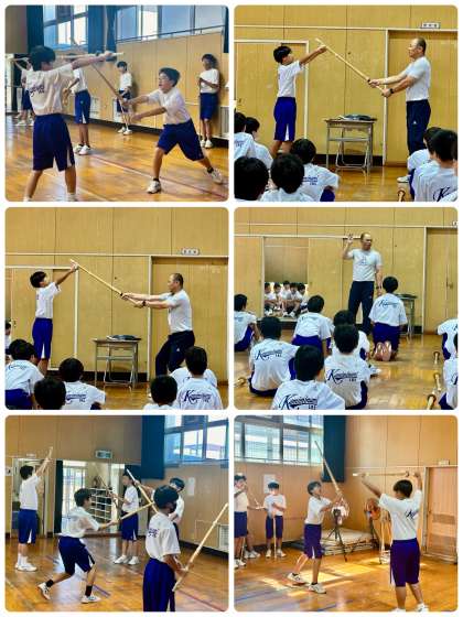 安全に剣道の学習ができるように、基本動作・基本打突を正確に身につけ、構えや体さばきと基本打突の仕方や受け方を一連の動きとして身につけるための授業です。