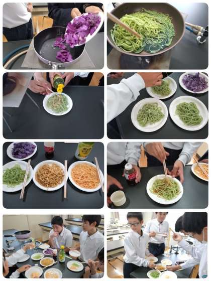 今日は紫キャベツのを使って、酸性中性アルカリ性で「色が変わる焼きそば」の実験をしました。引退した3年生も数名来てくれて、賑やかに活動できました。