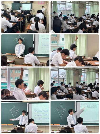 2年2組は、数学科の図形の調べ方(証明)を学習しました。「証明」の基本である、「仮定」や「結論」について理解し、「証明」の大まかな流れを確認しました。