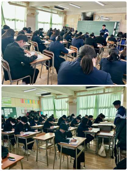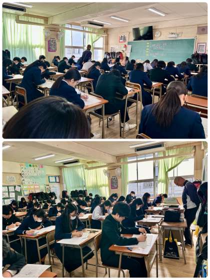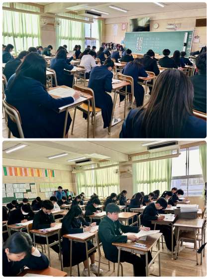 写真は、2限目の英語科テストで、ヒアリングテスト直後の様子です。上から順に、3−1、3−2、3−3です。
