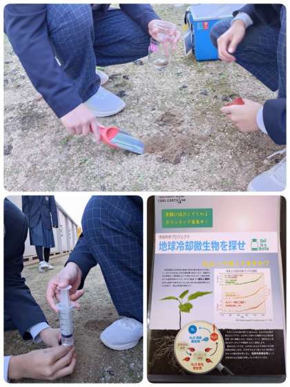 地球温暖化の原因になる温室効果ガスを消去する微生物を探すため、校内の土と空気を採取する実験を行いました。