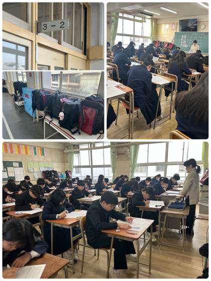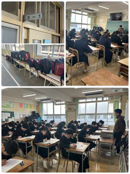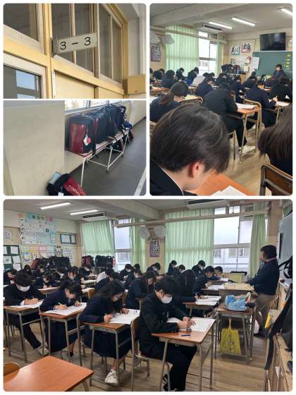 写真は1限目の英語科テストで、リスニングテストが終わった後、問題用紙のテストに取り組んでいる各学級の様子です。