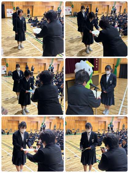 全校生徒の中で、121名が3000ページ達成表彰を受けました。2年と1年の代表の生徒がみんなを代表して、武市区長から表彰されました。おめでとうございます。