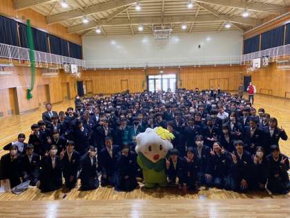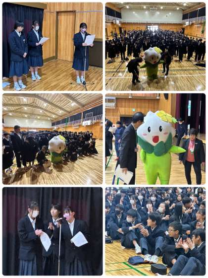 昨年度の約束ですが、来年度も同様にダントツなら、「ひらちゃん」を連れてきてほしいとお願いをしていたため、平野区のマスコットキャラクターで綿の妖精「ひらちゃん」が本校体育館にきてくれました。