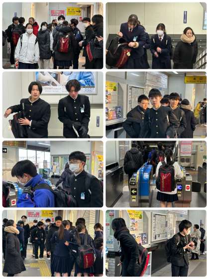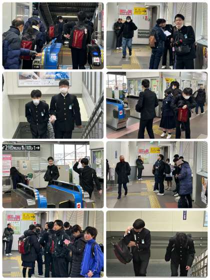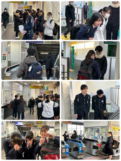 JR加美駅から乗車する生徒たちが次々にやって来て、林先生のチェックを受け、元気良く受験する高校に出発しました。
