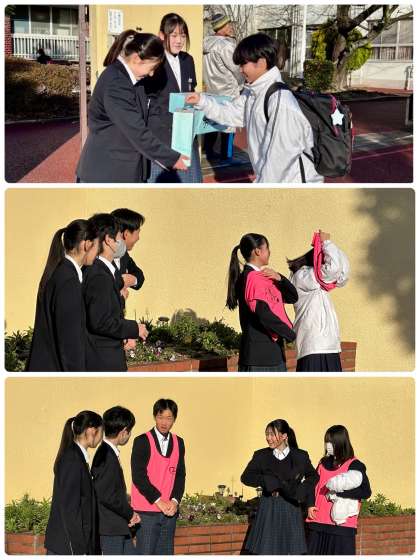 風紀委員のあいさつ運動もピンク色の「愛さつベスト」を着用して頑張っています。