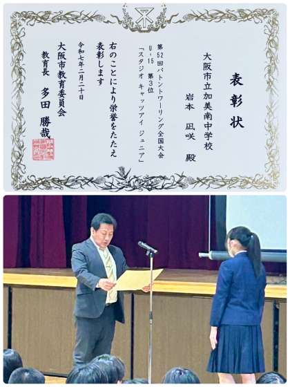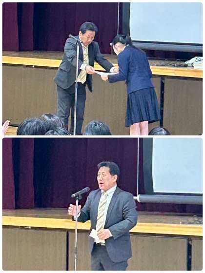 本日3月10日(月)1限目、卒業生を送る会に先駆けて、3年生の岩本凪咲さんの令和6年度の教育長表彰の表彰式を行いました。全国大会の優勝が市長表彰、全国大会の準優勝と第3位が教育長表彰を受賞します。
