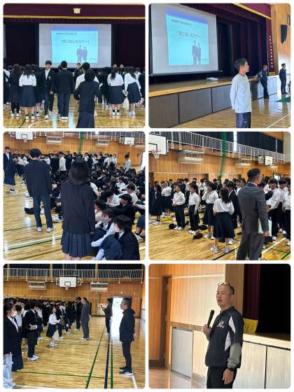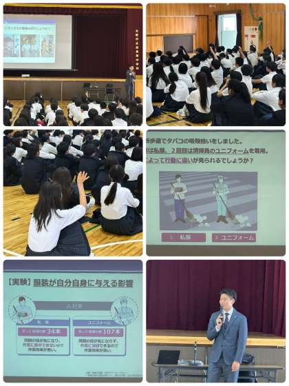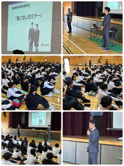 本日4月18日(金)6限目は、1・2年生合同の「着こなしセミナー」を体育館にて実施しました。本校の標準服メーカーである「カンコー」の方に来校していただき、標準服というか、みんなで揃えた制服の必要性の説明や着こなしについてのお話をしていただきました。