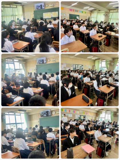 全校生徒との朝のあいさつの後、阪井校長先生から「部活動で学んでほしいことと「知・徳・体」についてのお話がありました。「人間関係」「責任感」「協力」の3つを学んでほしいことと「知・徳・体」の3つをバランスよく鍛え、常に向上心を持って毎日を過ごしてほしいとのお話でした。