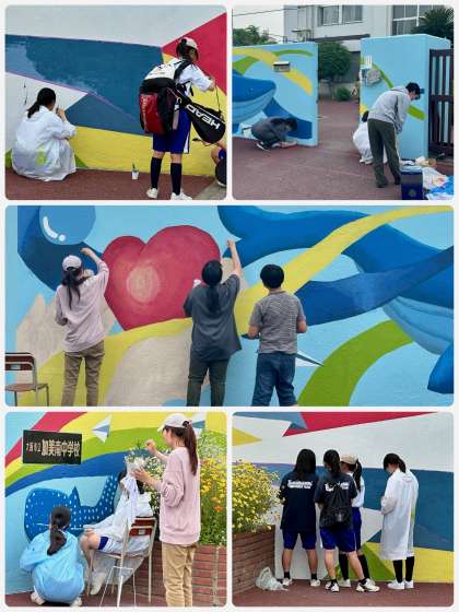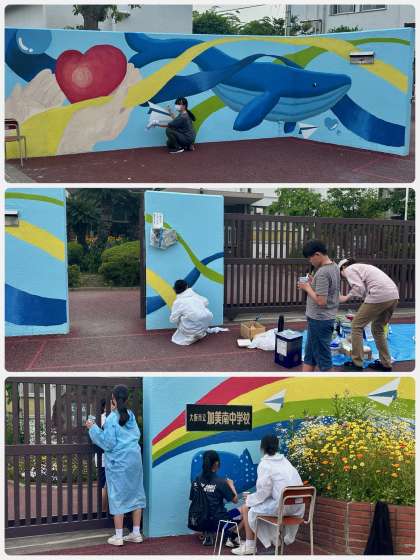 本日5月1日(木)も昨日に引き続いて、午後から美術部員たちが、第5回目の創立50周年記念事業壁画作成作業を行いました。