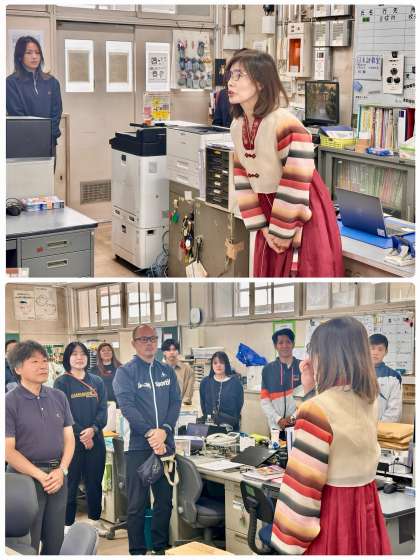 全校集会後の職員朝礼にて、教育実習生の紹介と本人からのご挨拶、金英淑ソンセンニムの紹介と本人からのご挨拶が行われました。