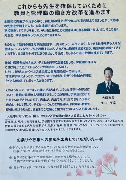 教員が子どもたちの前で生き生きと働き、子どもたちの教育環境を充実させ、子ども一人ひとりに向き合い、質の高い教育を提供し続けるためにご理解とご協力をお願いします。この市長のメッセージにつきましては、ミマモルメでも送信させていただいております。