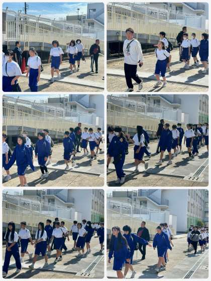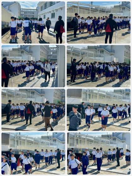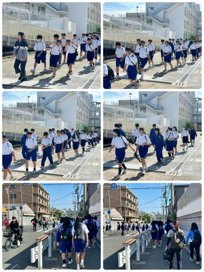 体育館北側に集合整列し、西門よりJR加美駅へ、1組から順番に担任の先生を先頭に出発しました。