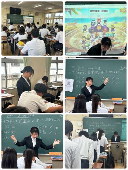 前置詞の違いを理解し、適切な前置詞を使えるように学習しました。一人一台端末の「Kahoot」で、前置詞の使い分けのクイズを行い、問題ごとに、なぜその前置詞になるのかを確認しました。