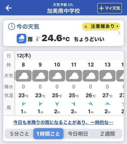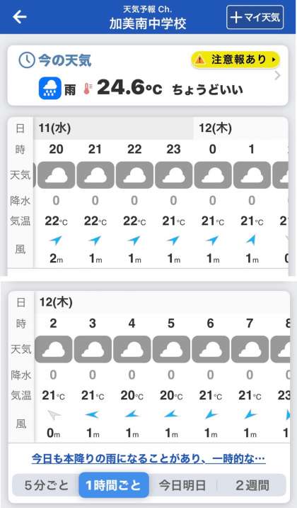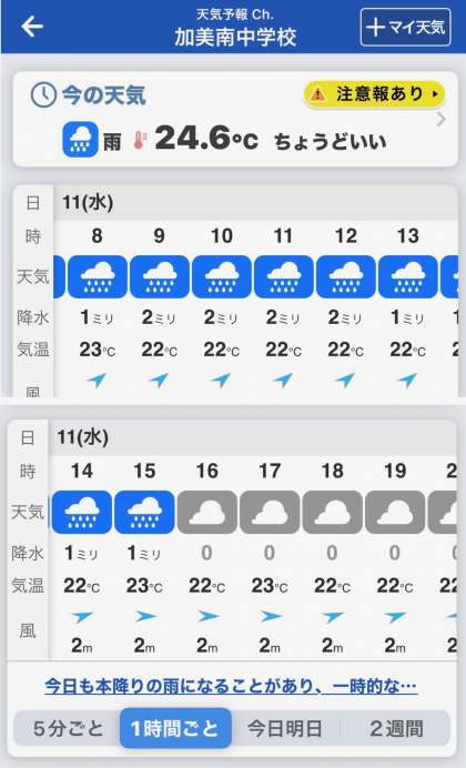 下記のウェザーニュースの加美南中学校では、この後、明日夕方まで雨が降り続く予報です。