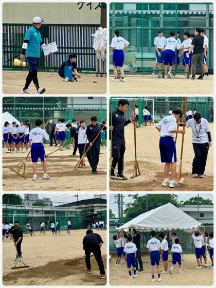 7時30分に登校している係生徒と先生たちによって、急ピッチでグランドの準備をしています。