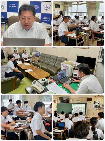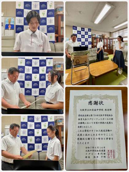 今朝は校長室にてオンラインでの全校集会を行いました。全校生徒とのあいさつの後、一昨日の大阪府ラグビー大会決勝戦のアナウンスをしてくれた2名と放送部への感謝状の表彰がありました。