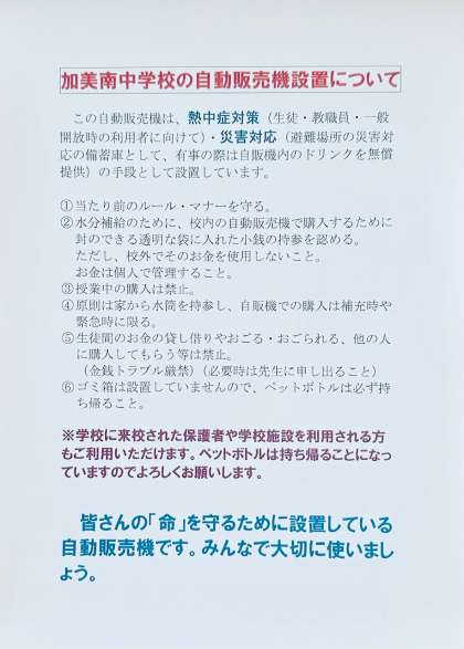 熱中症対策の水分補給として、家から水筒もしくはペットボトルを持参するという本校のルールに、校内の自動販売機で購入しても良いが加わりました。