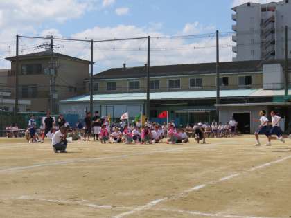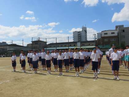 6月2日(木)本校第39回体育大会を実施しました。例年9月に実施していましたが、今年は秋にプール工事等が入る関係で6月実施としました。気持ちのいい初夏の晴天に恵まれ、清々しい空気を胸いっぱい吸い込みながら開会しました。ほんの一部ですが紹介します。まずは、開会式の様子と50m走の一場面です。