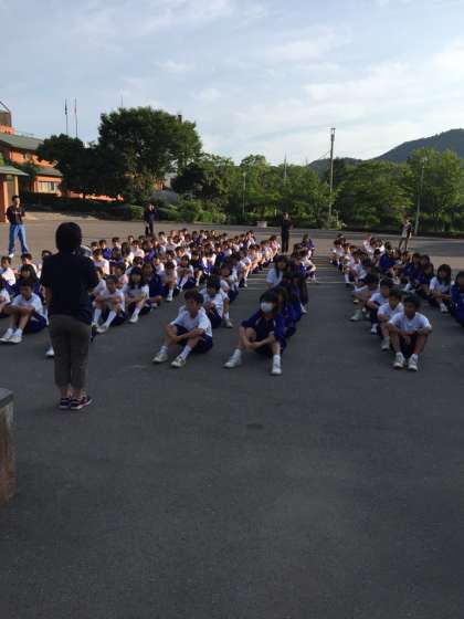 一泊移住2日目の朝のつどいです。時間にぴったり集合でき、元気にラジオ体操をしました。天気は快晴、体調不良者もなく皆元気です。