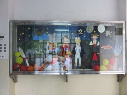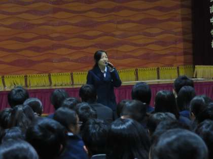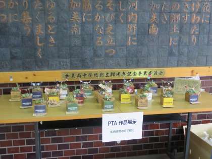 「舞台発表の部」の「生徒会長による閉会のことば」、「展示の部」の「PTA作品」、「美術部作品」展示場所の様子です。