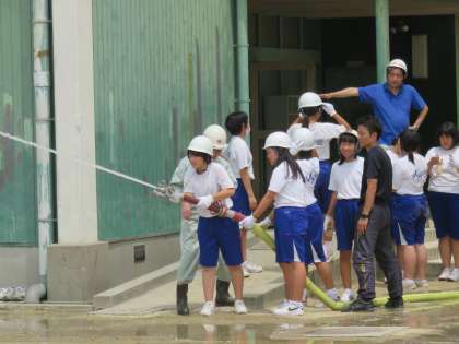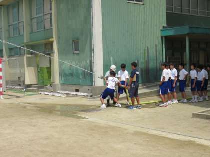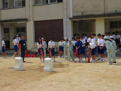 2年生可搬式ポンプ放水体験、水消火器による消火活動の様子です。