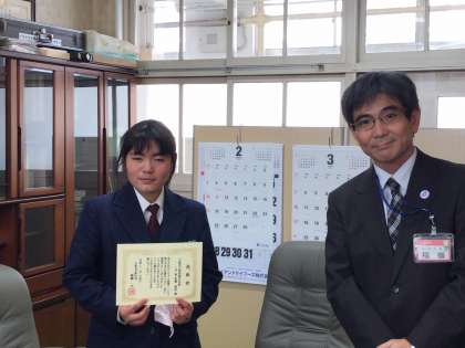 校長室にて、「がんばる中学生」の区長表彰が