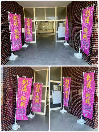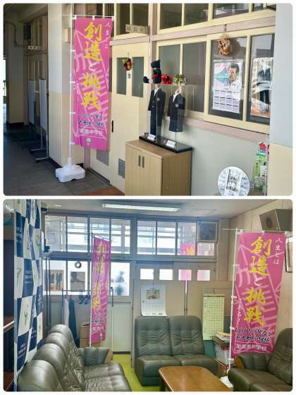 9/1(月)に予告していた「加美南中学校のぼり旗」が完成して届きました。前回にもお知らせしたように、本校のシンボルとして、「人生とは創造と挑戦である!」「100%の努力と年中無休の継続」との名言が2つ描かれています。