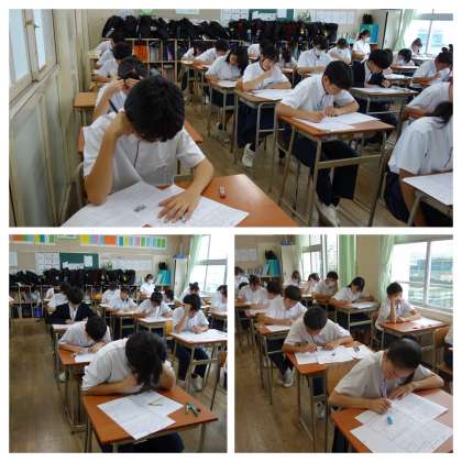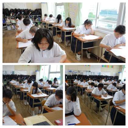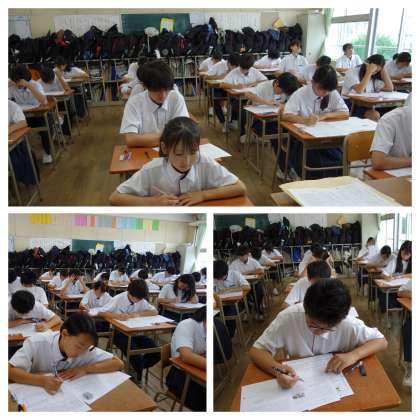 今日は前から撮影しました。写真は1限目の英語科テストの様子です。上から順に3枚ずつ、1−1、1−2、1−3です。