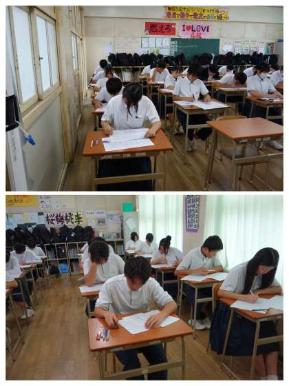今日は前から撮影しました。生徒たちは全員、真剣にテストに取り組んでいます。写真は1限目の国語科テストの様子です。上から順に3枚ずつ、3−3、3−4です。