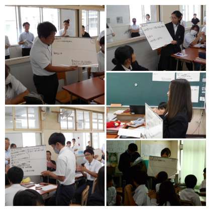 阪井校長先生と大阪市総合教育センターの指導主事や指導員の方々を加えると30人以上の先生方を前に、生徒たちは意見を出し合っていました。