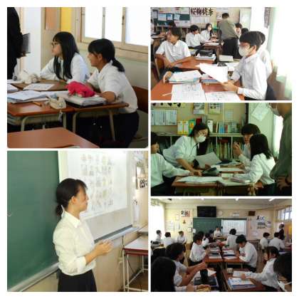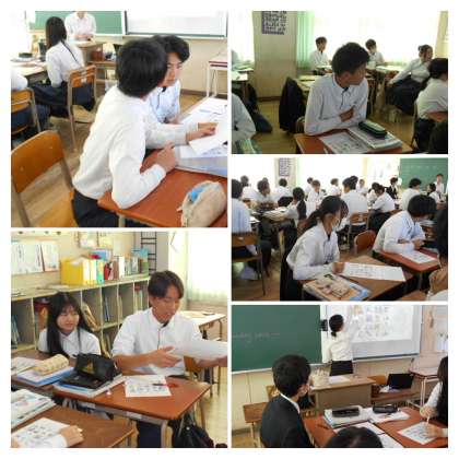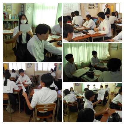 4人組の班編成を行い、関係代名詞を使って文章を作り、陣取りゲームを行いました。