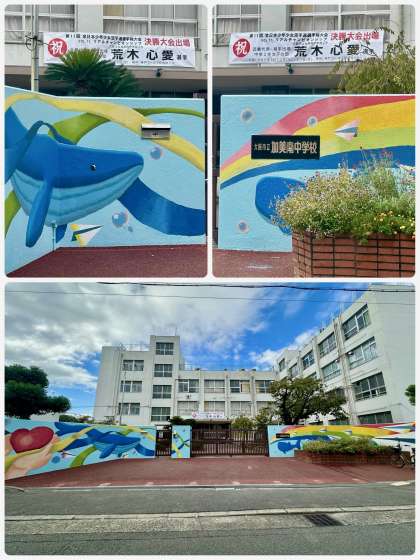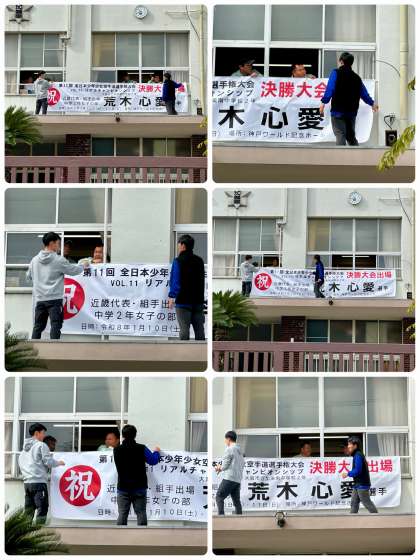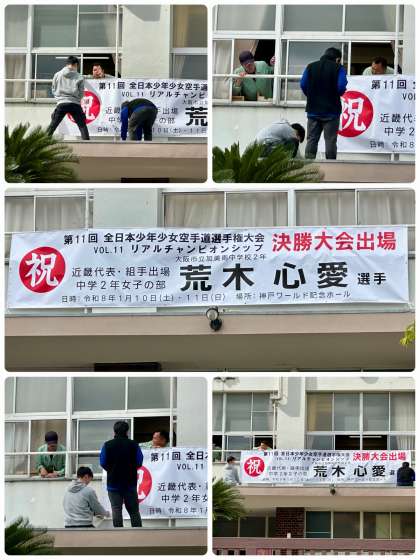 去る5/6(火)の近畿空手道選手権大会、中学2年女子の部で優勝し、5/26(月)の全校集会で表彰し、予告もしていましたが、1/10(土)・1/11(日)に神戸ワールド記念ホールで開催される、第11回全日本少年少女空手道選手権大会への出場を応援する横断幕を掲示しました。