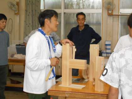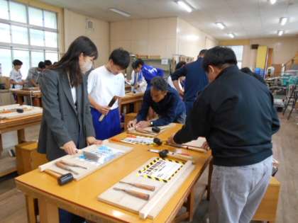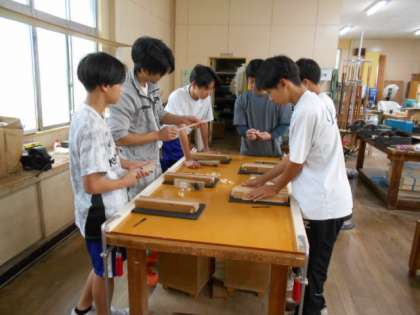 本日、全建総連大阪建設労働組合の方々に、ものづくり体験型の教室を開いていただきました。サッカー部の部員が参加して、六本組木とmy箸作りを行いました。使い慣れていないのこぎりやノミ、カンナを使い、黙々と作製に取り組んでいました。