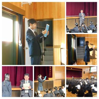 本日は体育館にて全校集会を行いました。全校生徒とのあいさつの後、一昨日の大阪市秋季ラグビー大会決勝戦のアナウンスをした放送部員2名への感謝状の表彰伝達がありました。