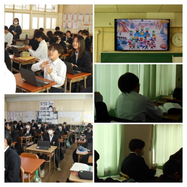 電車の乗り換えー道案内ーの単元の授業で、状況や相手の要望に応じて、乗り物での行き方を伝えることを学習しました。続いて、教室内のテレビ画面を見ながら、簡単な問題と難しい問題を組み合わせたクリスマスクイズ25問を行い、全員が盛り上がっていました。最後は教科書の内容理解をしました。