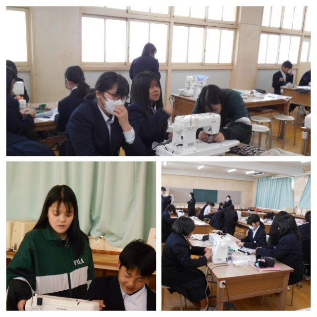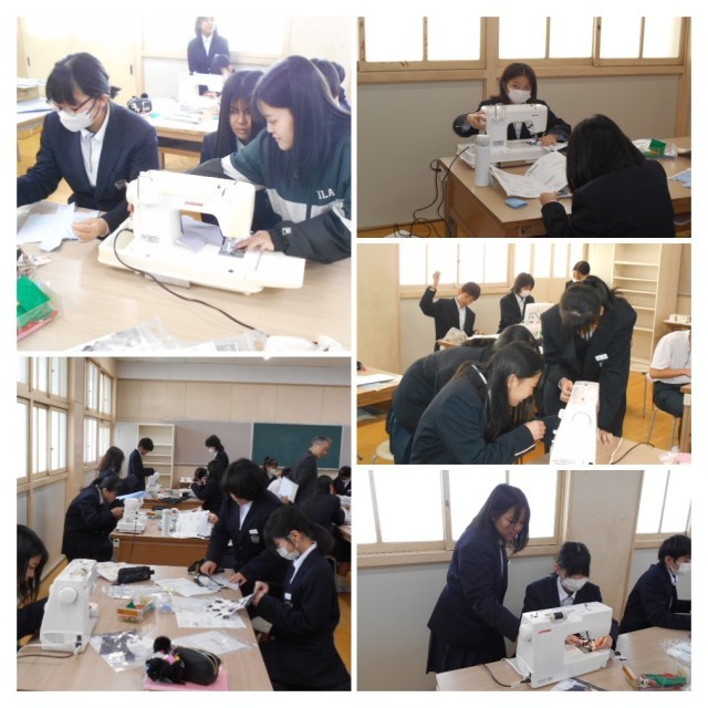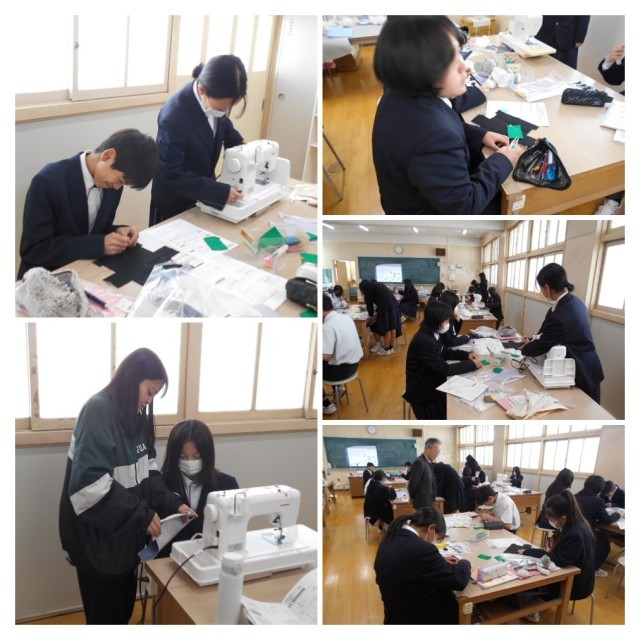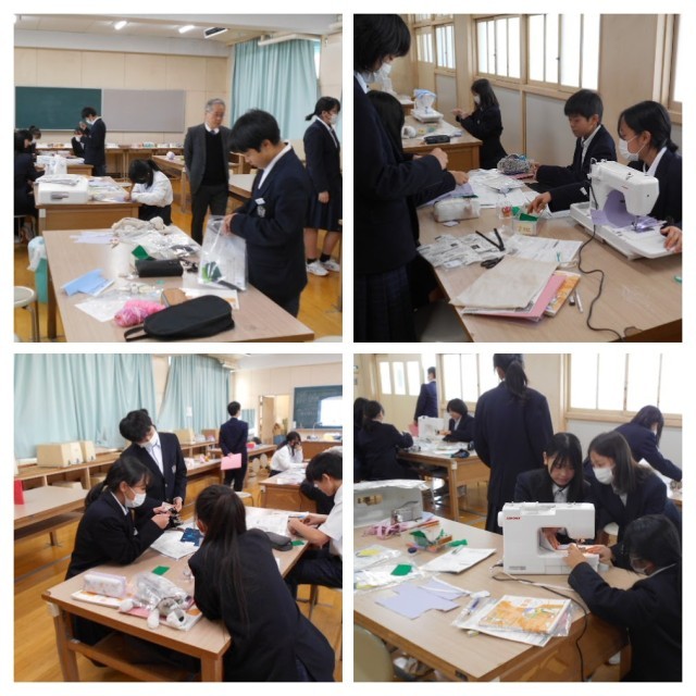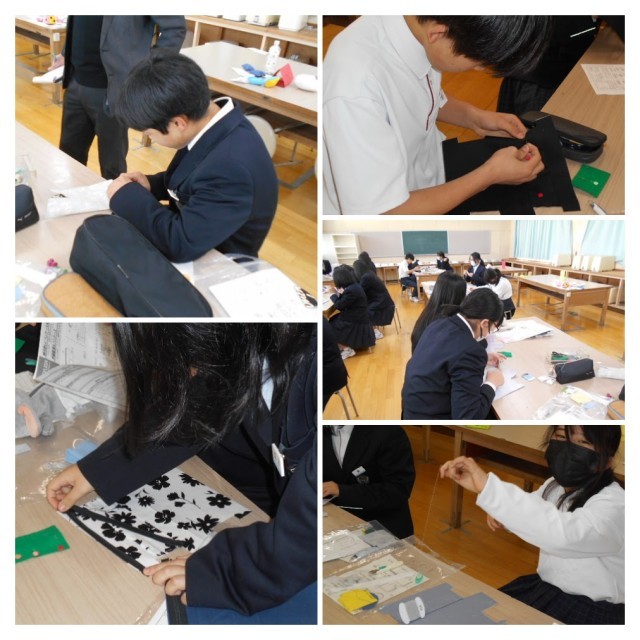 「ペンケース作り」の作業の続きを北館3階被服室で行いました。使いやすさと仕上がりを考えながら、布やファスナーの裏表やまち針を打つ場所を説明書や板書から正しく読み取り、ポケットとファスナーを丁寧に縫い付けました。