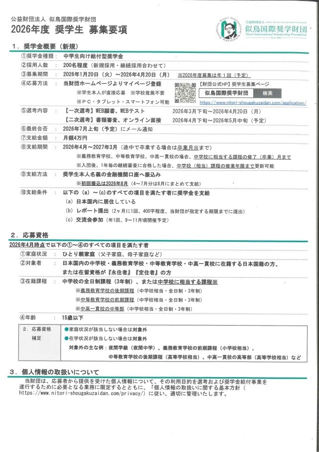 中学生向け給付型奨学生募集の案内が届きましたのでお知らせいたします。