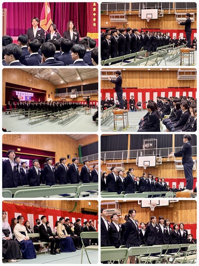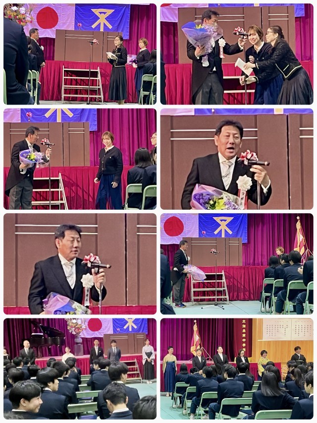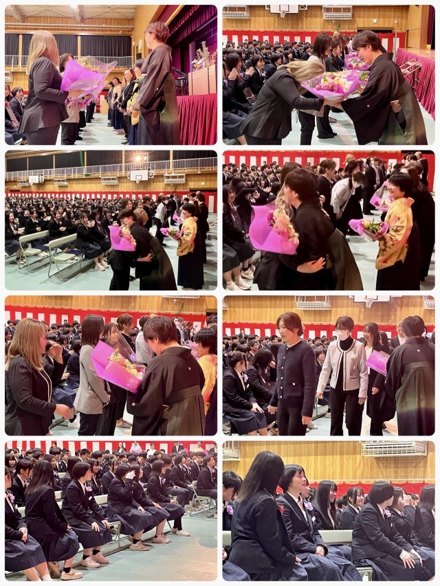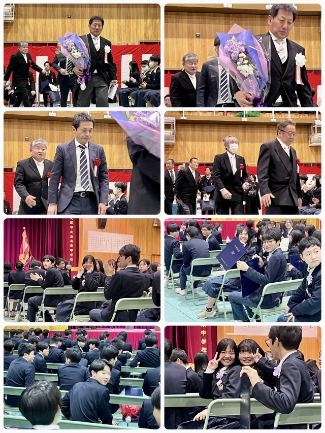 卒業式が閉式し、続いて「同窓会入会式」「記念品贈呈」「保護者代表謝辞」「3年担当教員及び広瀬教頭先生への花束贈呈」を行いました。