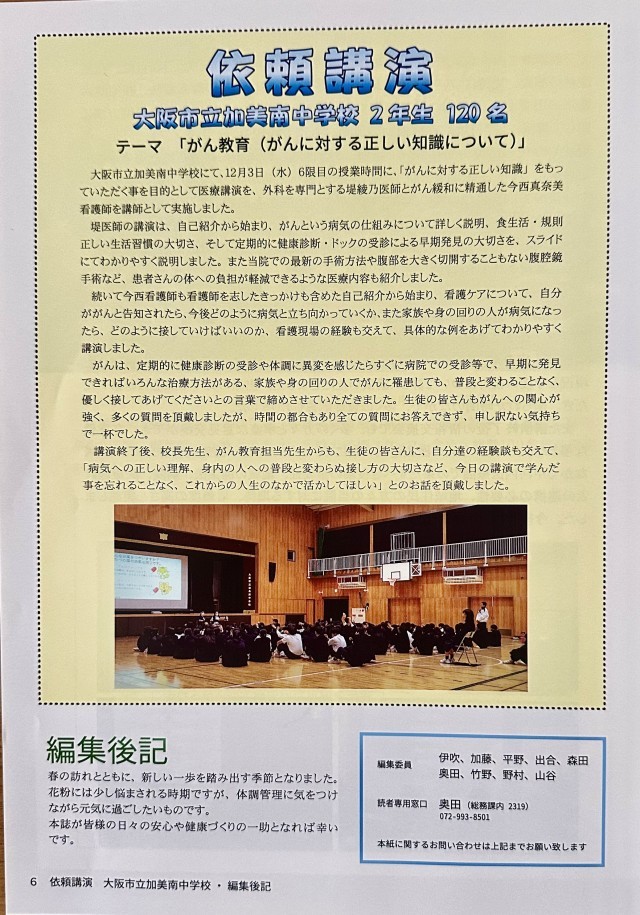 八尾徳洲会総合病院で発行している「かけはし」3月号に本校での講演の様子を掲載していただいています。