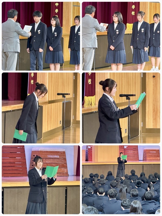 修了式に引き続き、生徒会認証式が行われました。令和8年度前期役員の皆さん、よろしくお願いします。新会長から令和8年度に向けてのあいさつがありました。