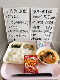 1/28(水)給食 小松菜っぱ飯、鮭のマリネソースがけ