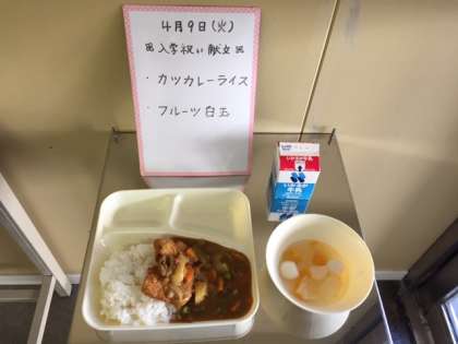 今日のメニューは、カツカレーライス、フルーツ白玉です。美味しく、いただきました。